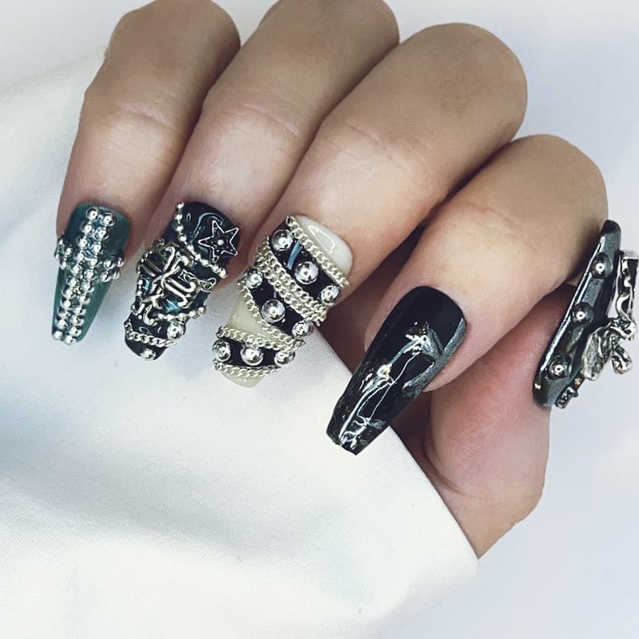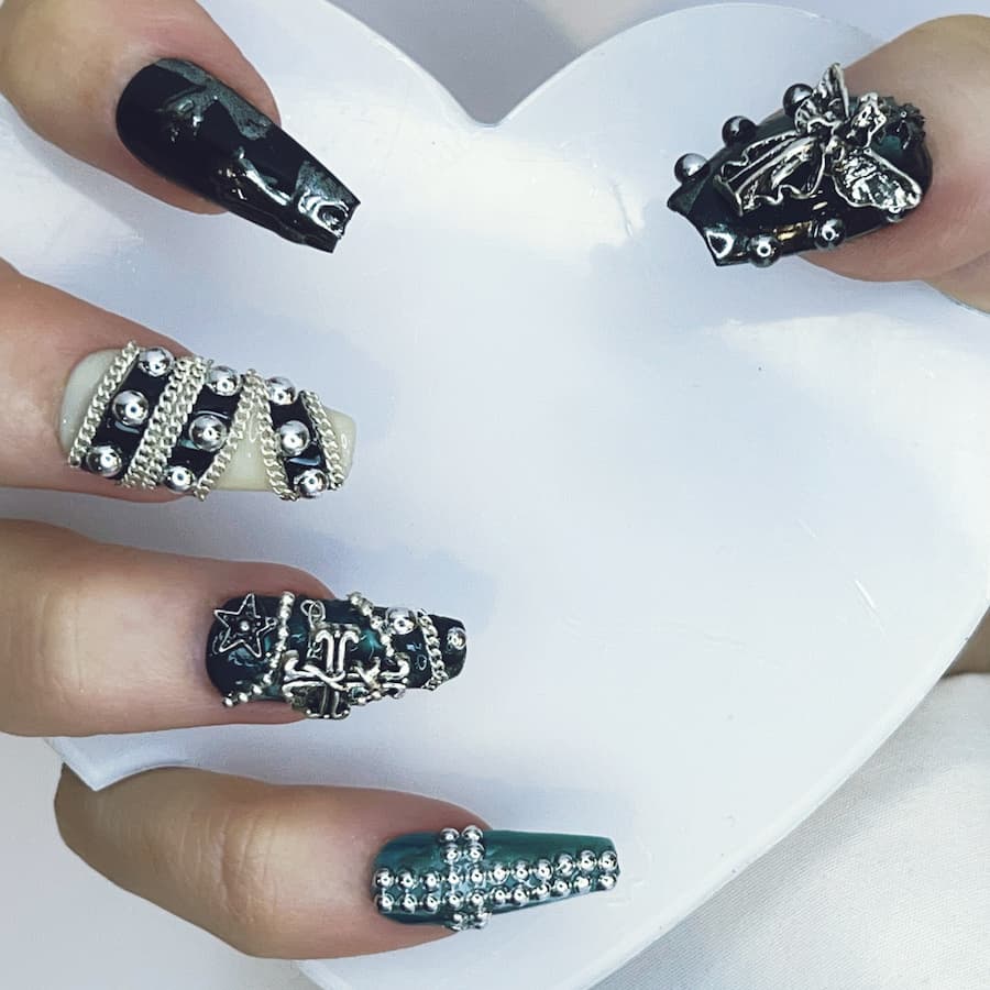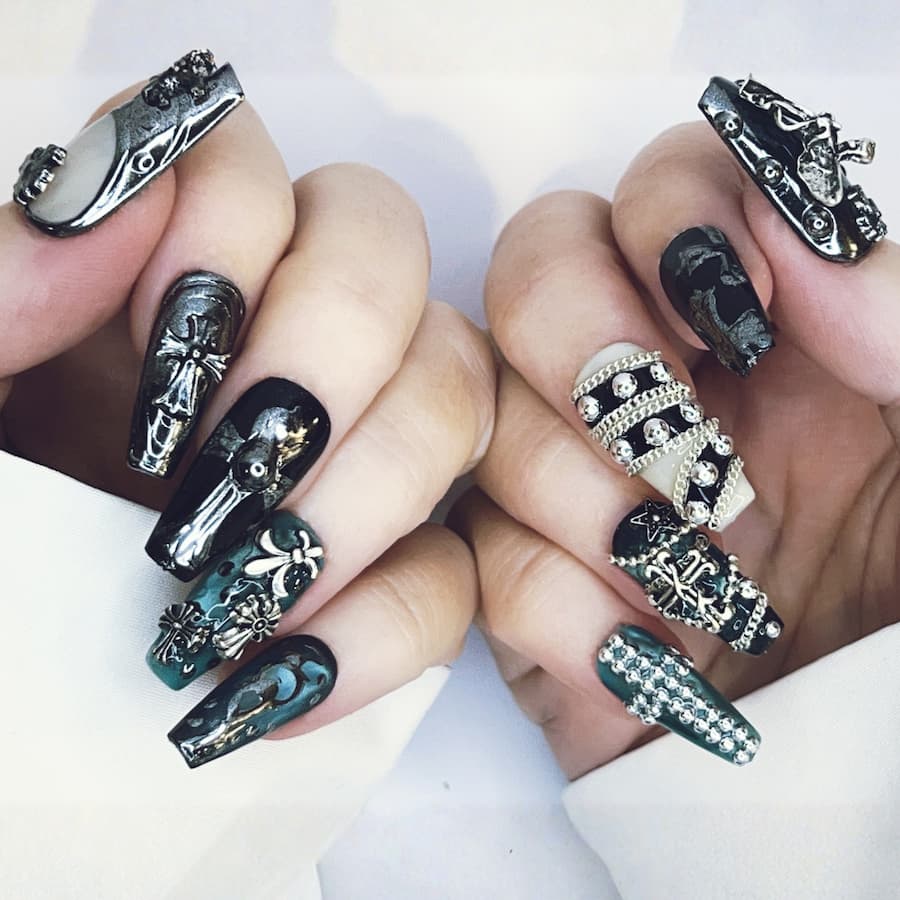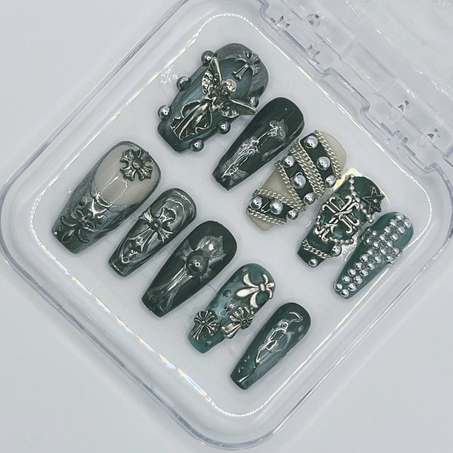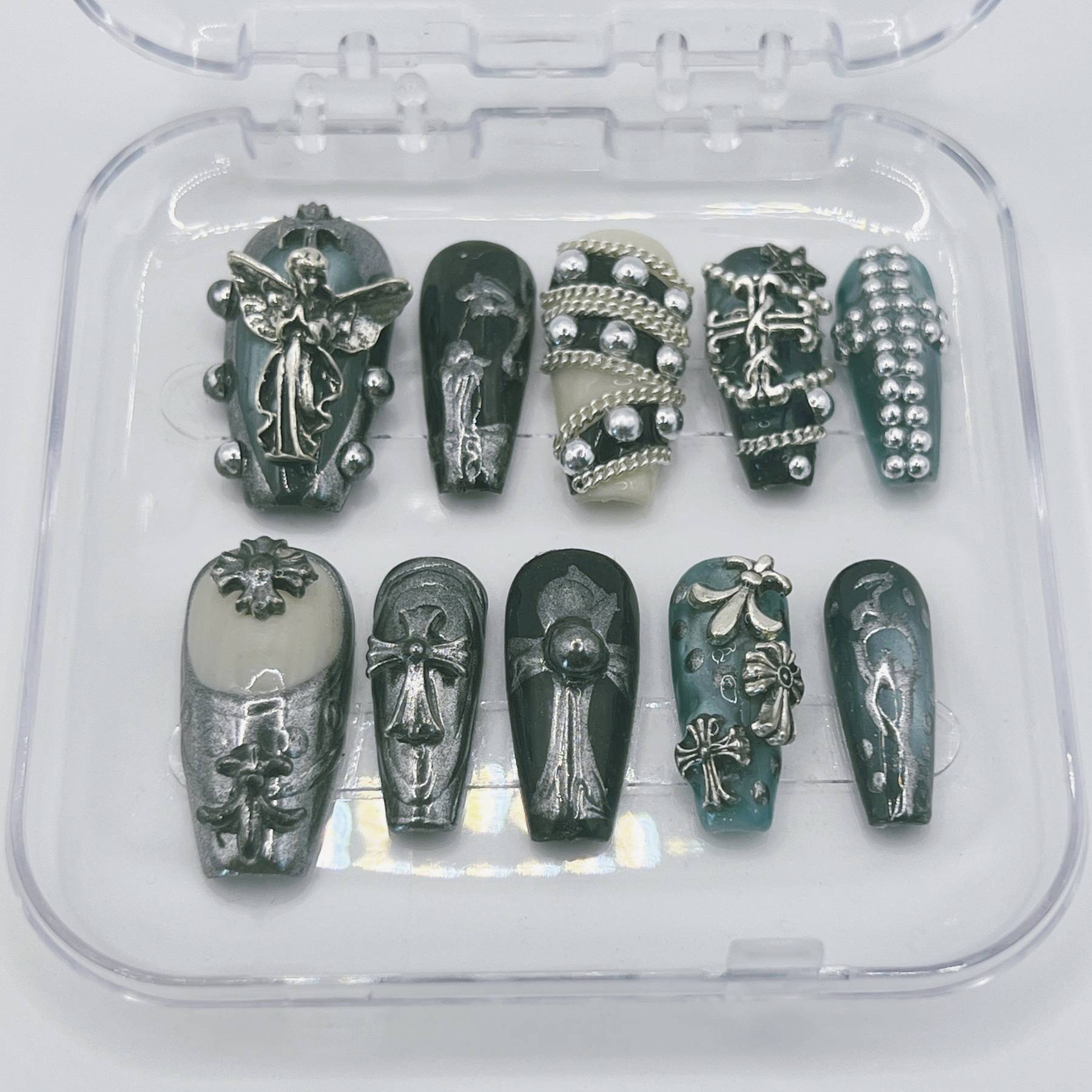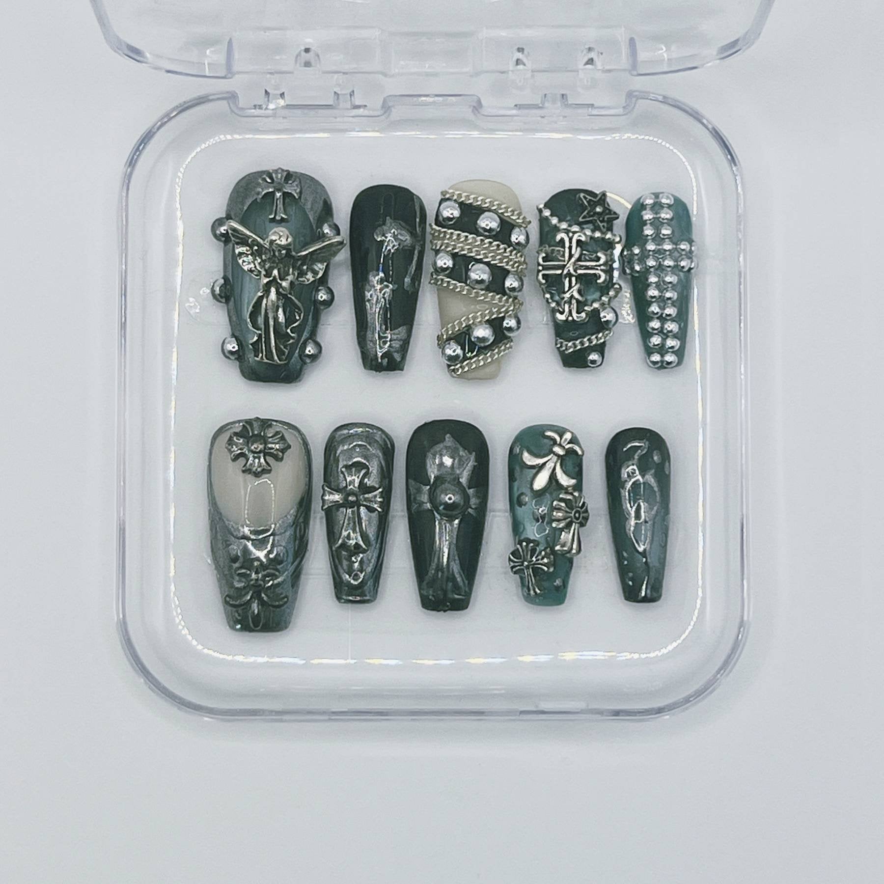 Jet-black bases meet ornate metallic detailing, sculptural crosses, and antique-finish accents for a look that feels reverent, dangerous, and impossibly chic. Each nail is handcrafted after purchase and custom-sized to your exact measurements—delivering museum-level artistry without the salon markup.
