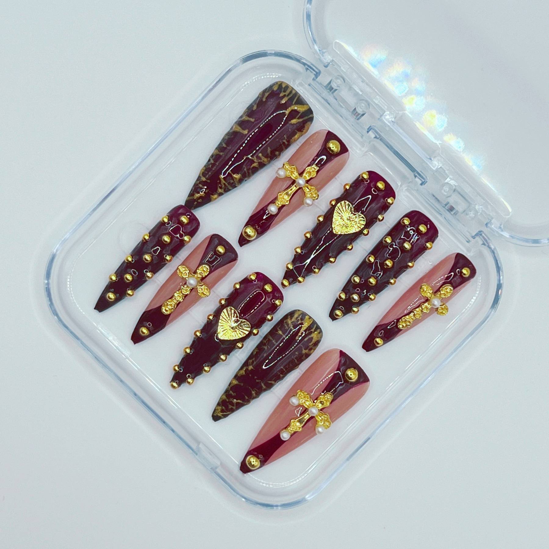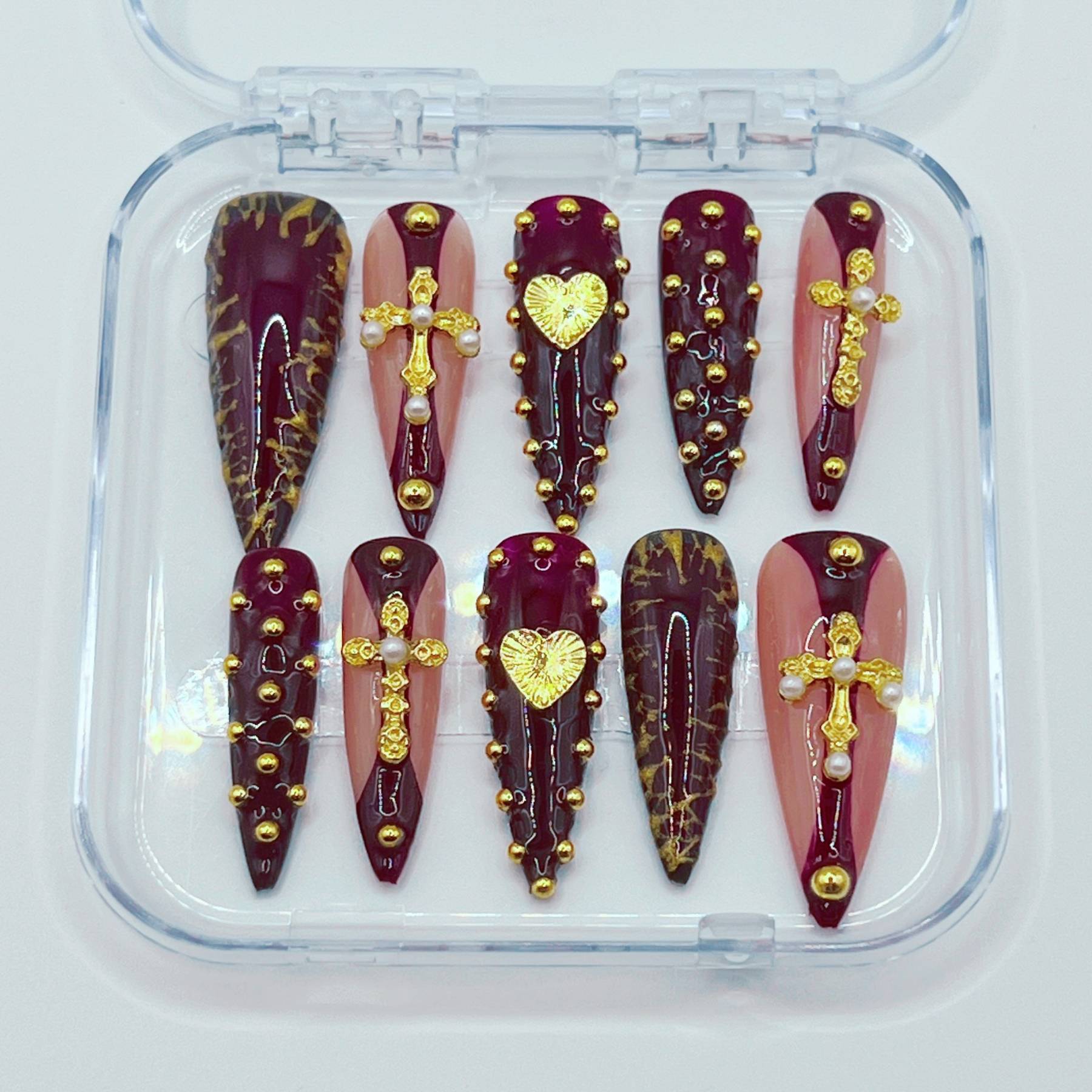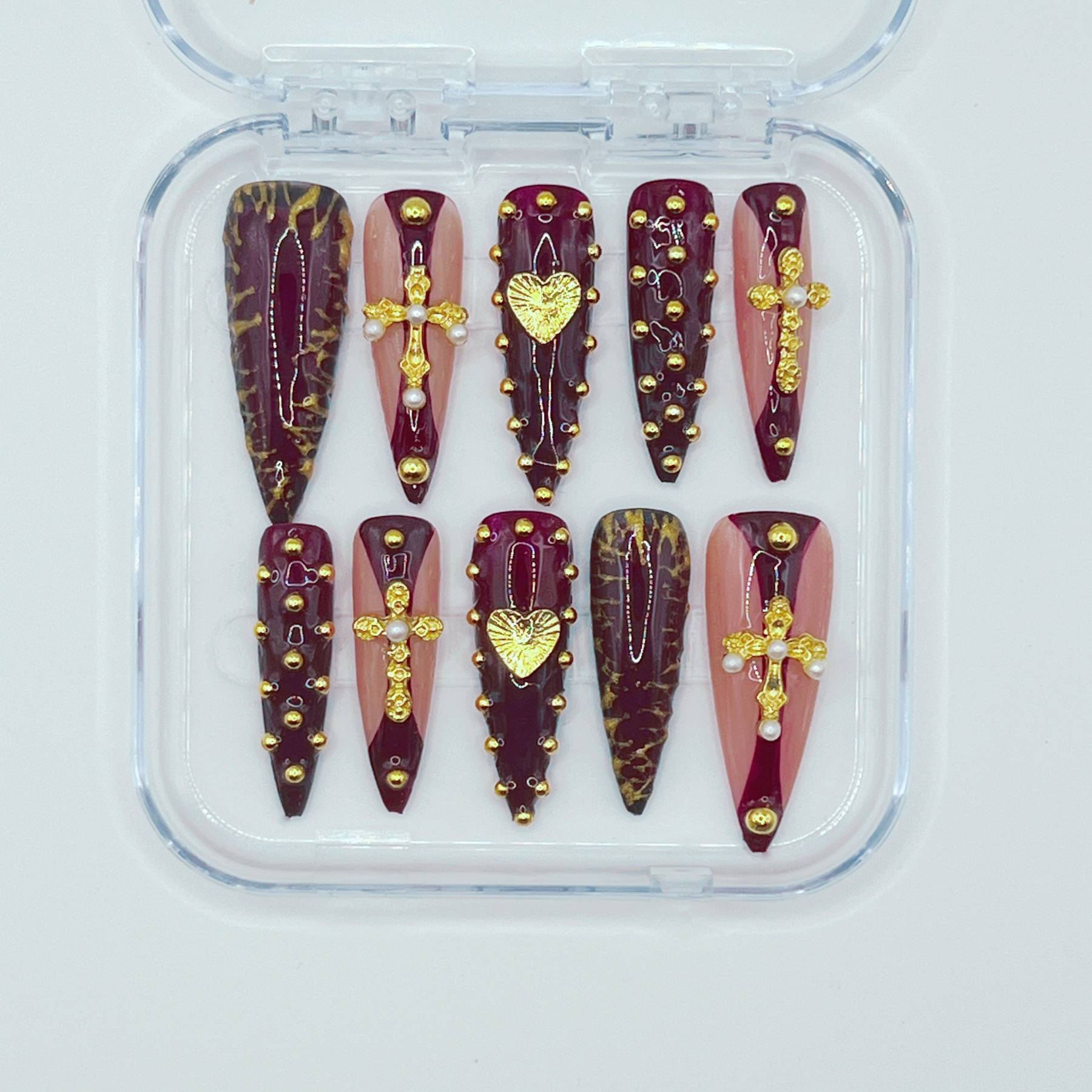A relic worthy of worship. Crimson Reliquary pairs deep, cathedral red with gilded crosses, heart motifs, and ornate gold detailing. The rich colour palette and sculptural accents create the feeling of sacred artifacts sealed within a royal reliquary. Dramatic yet elegant, this set embodies devotion, mystery, and old-world opulence.