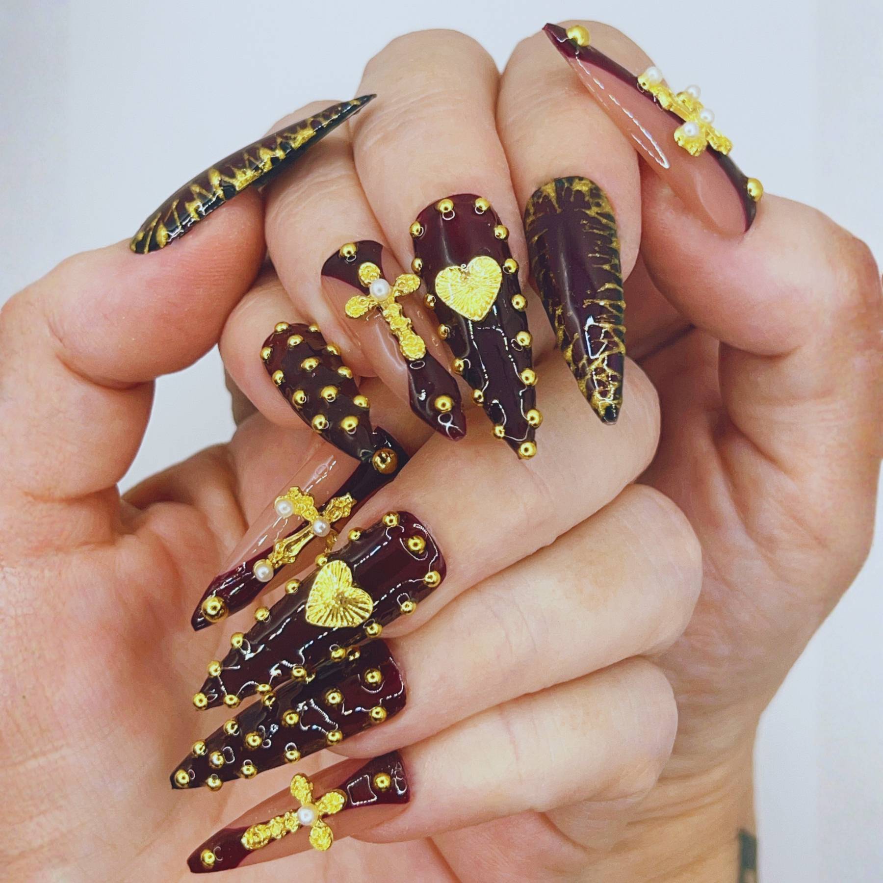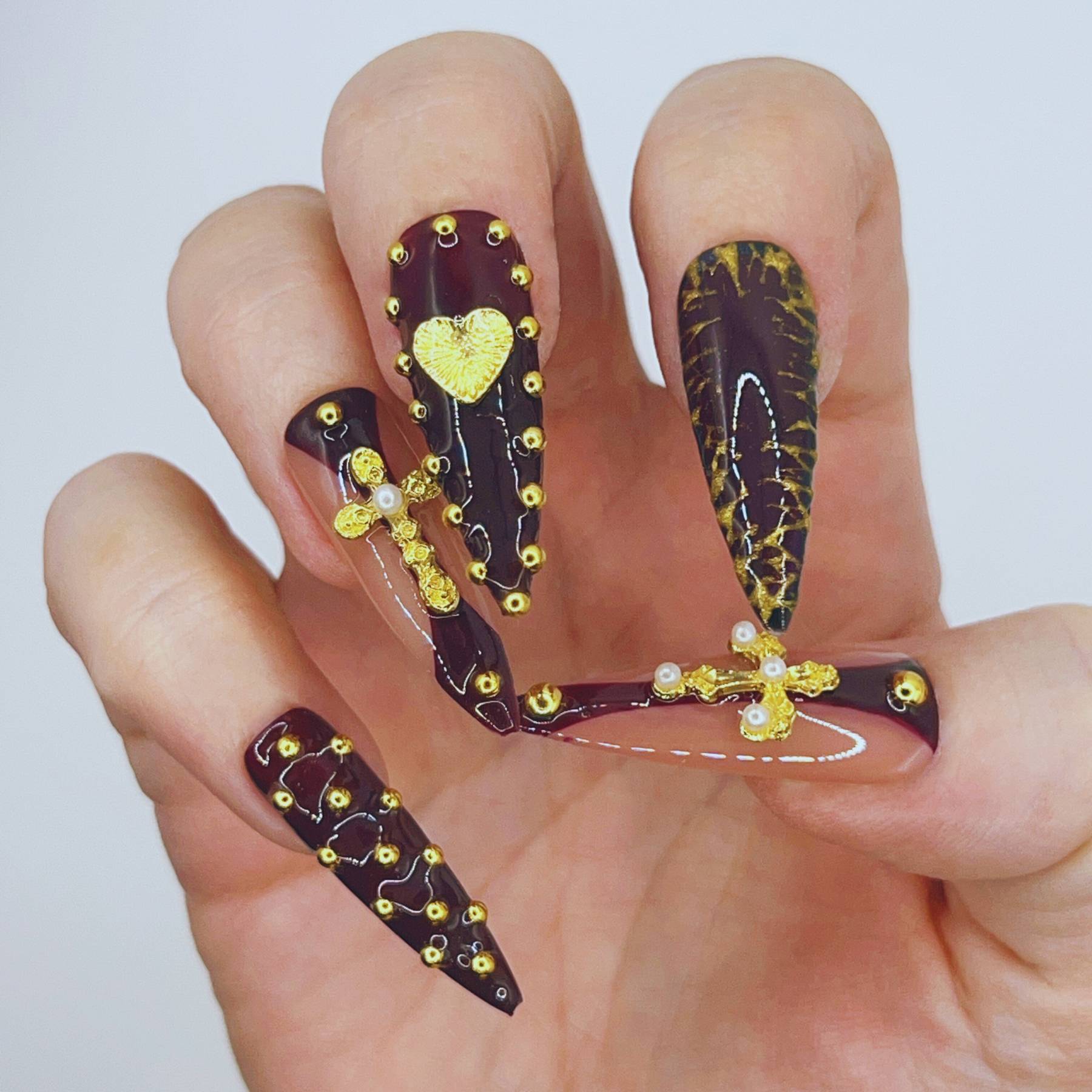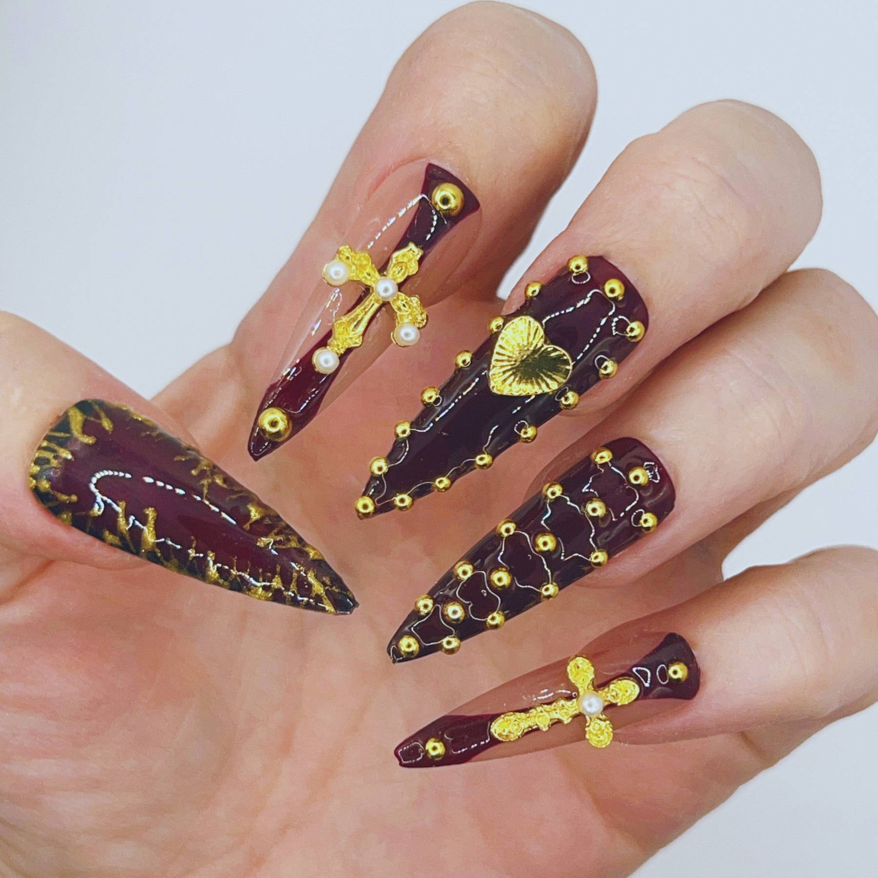 A relic worthy of worship. Crimson Reliquary pairs deep, cathedral red with gilded crosses, heart motifs, and ornate gold detailing. The rich colour palette and sculptural accents create the feeling of sacred artifacts sealed within a royal reliquary. Dramatic yet elegant, this set embodies devotion, mystery, and old-world opulence.