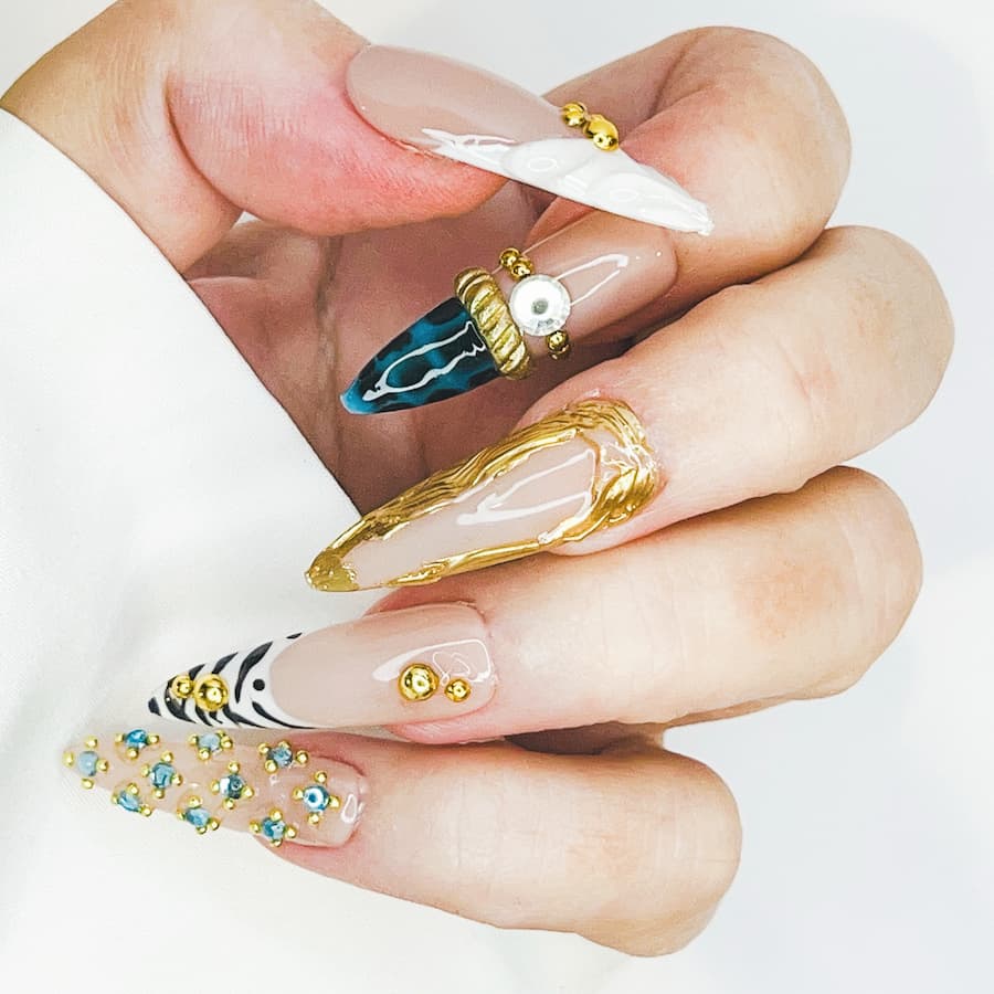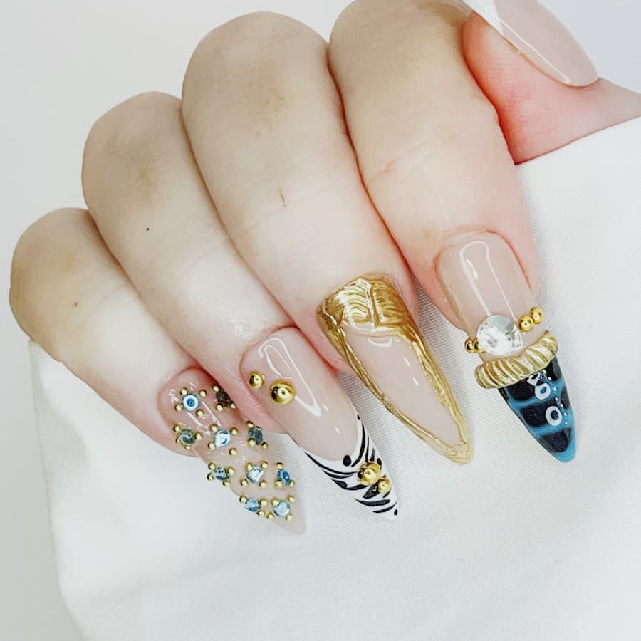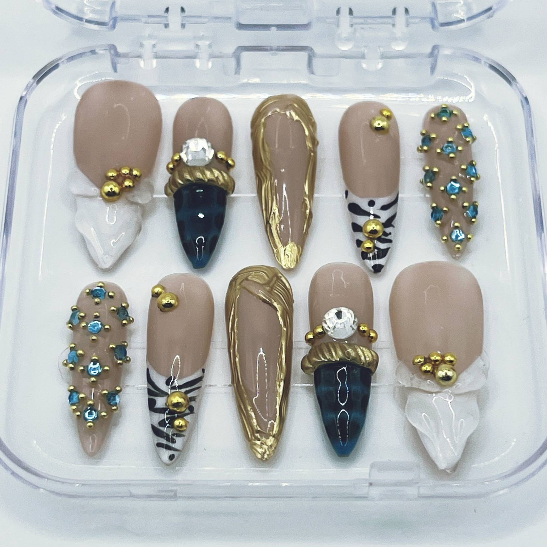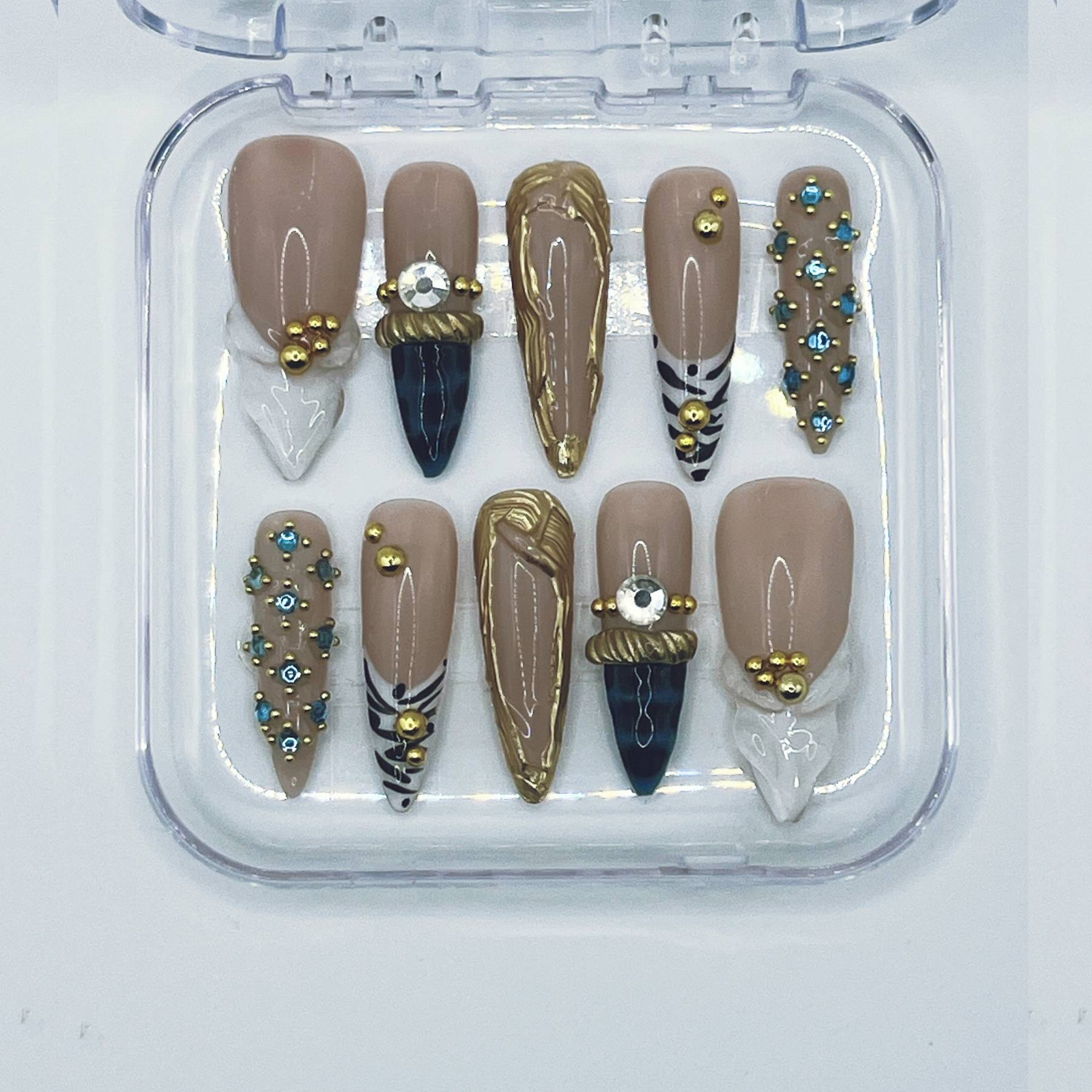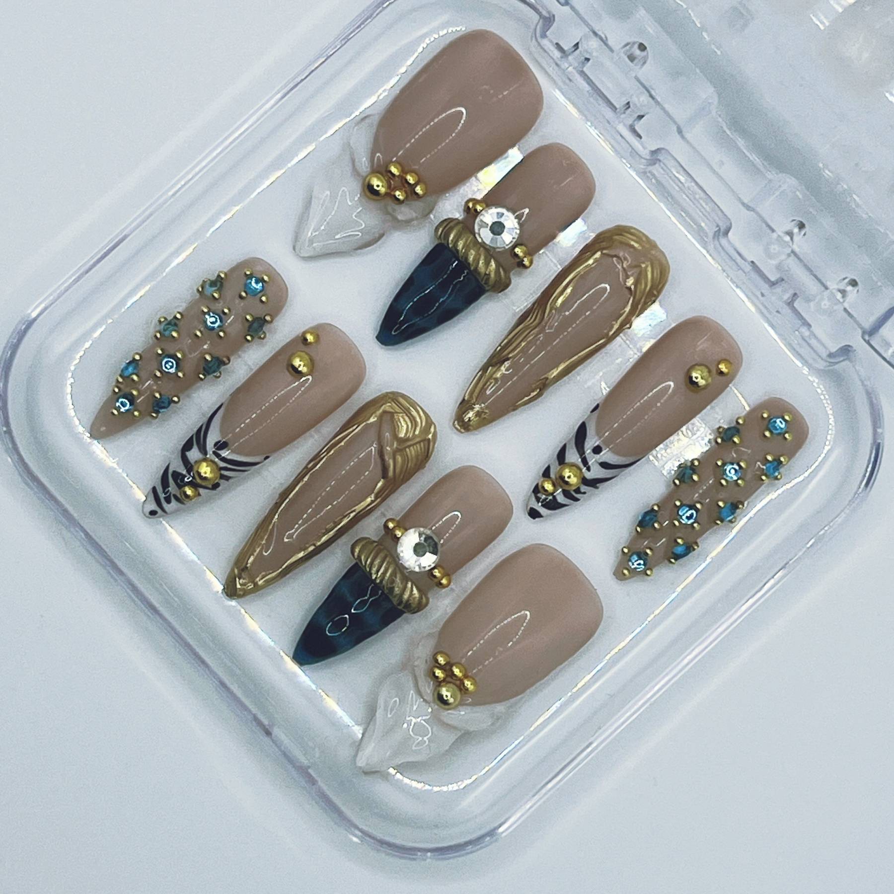 Gilded Icon is a made-to-order statement set featuring glossy nude bases framed with sculpted gold detailing, crystal accents, bold tips, and editorial textures.