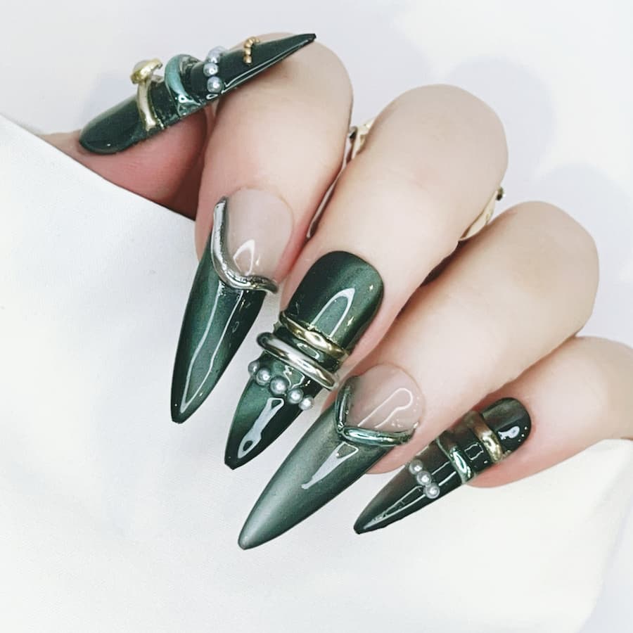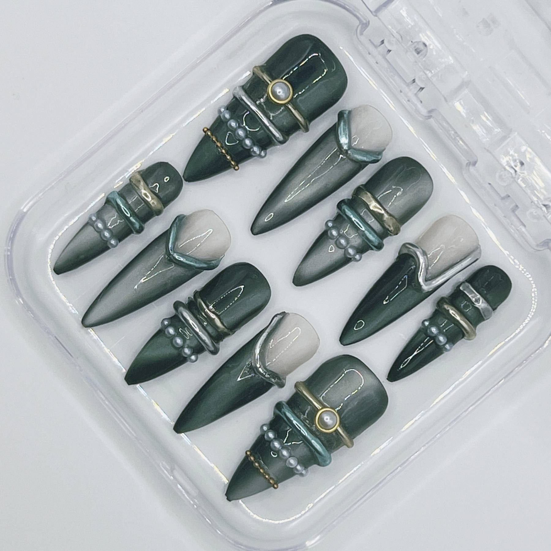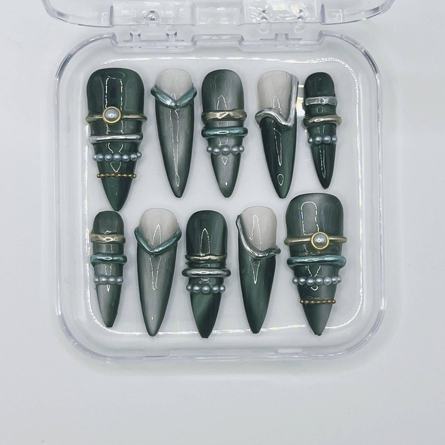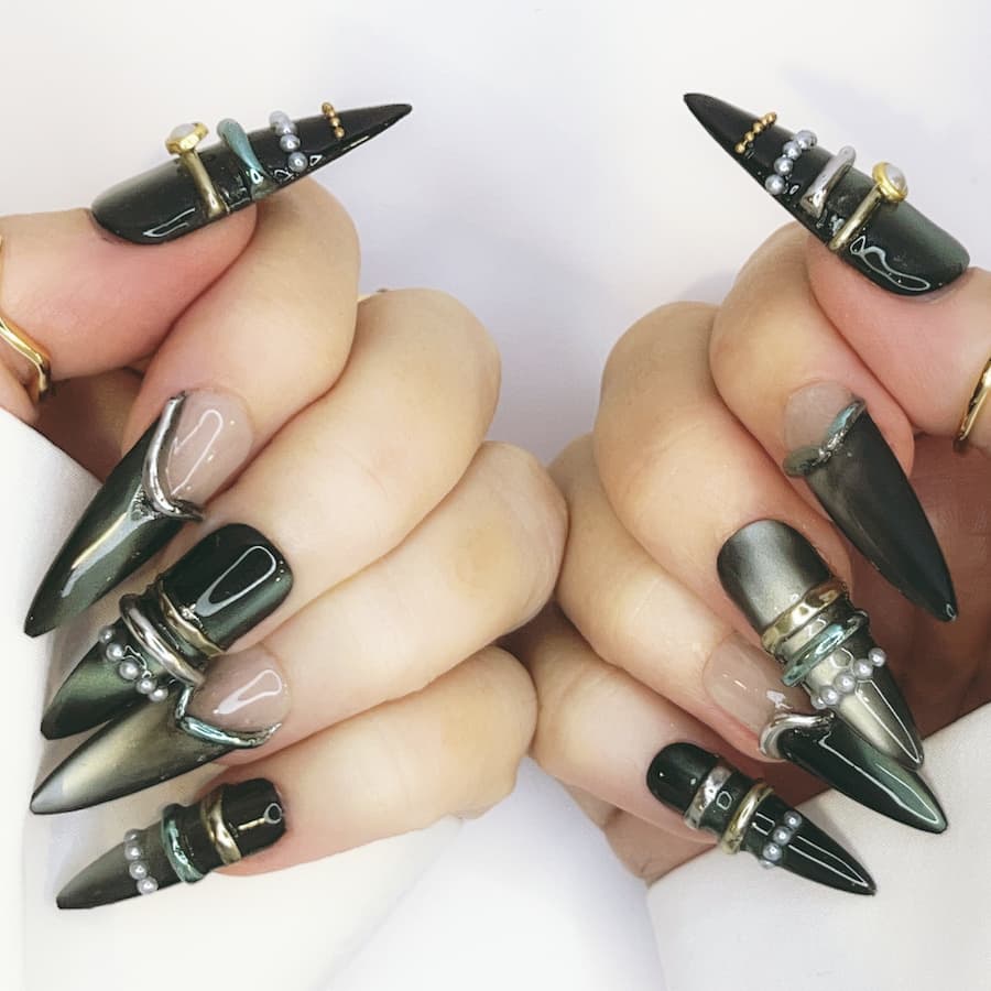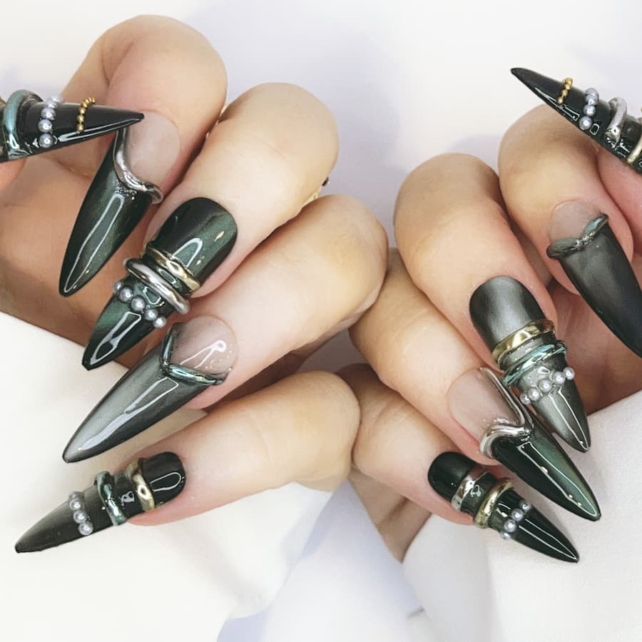Featuring gunmetal finishes, sculptural spike accents, hardware-inspired detailing, and high-shine metallic textures, this design channels raw power with runway polish. Each nail is individually handcrafted after purchase and tailored to your exact measurements for a flawless, custom fit—delivering couture-level edge without the salon markup.