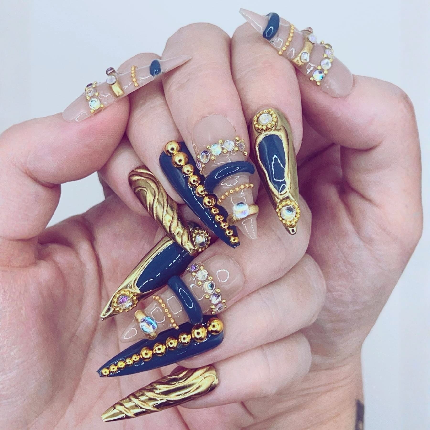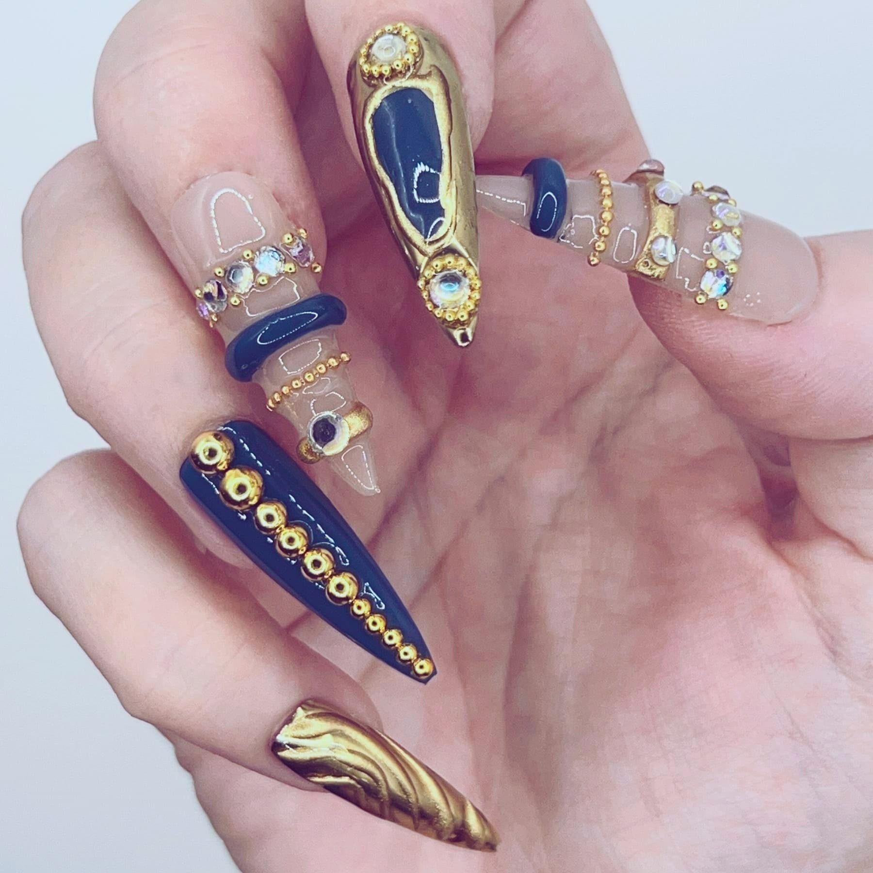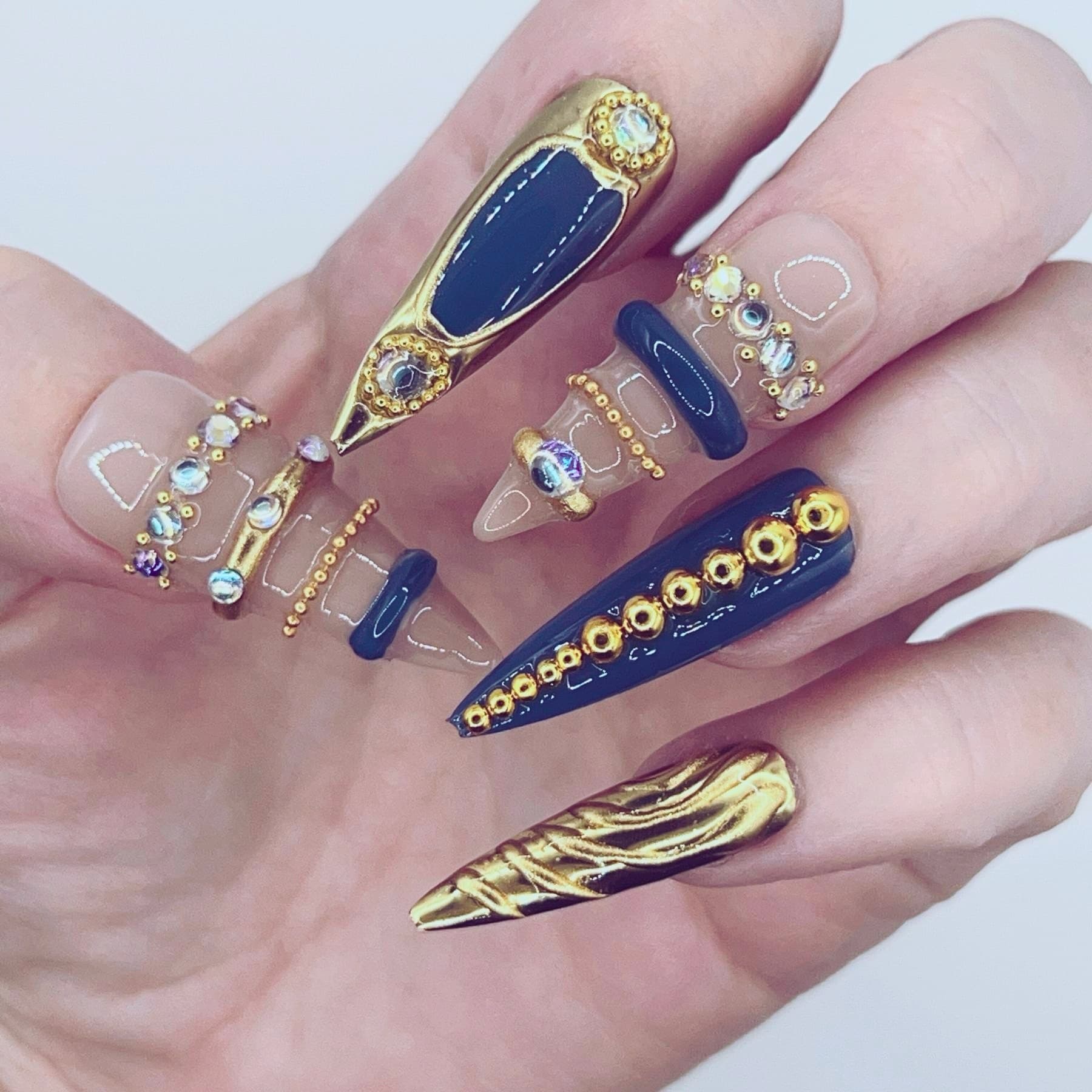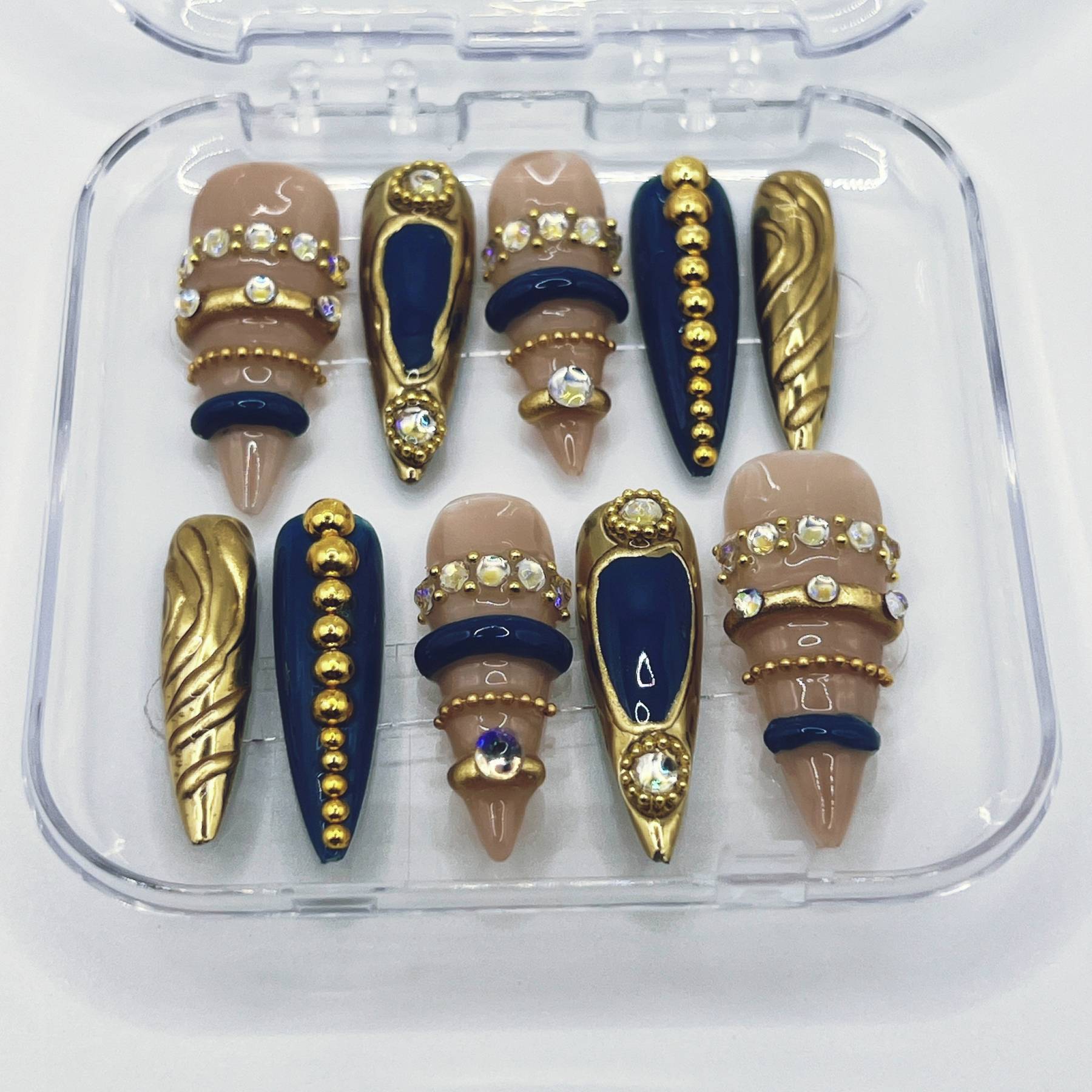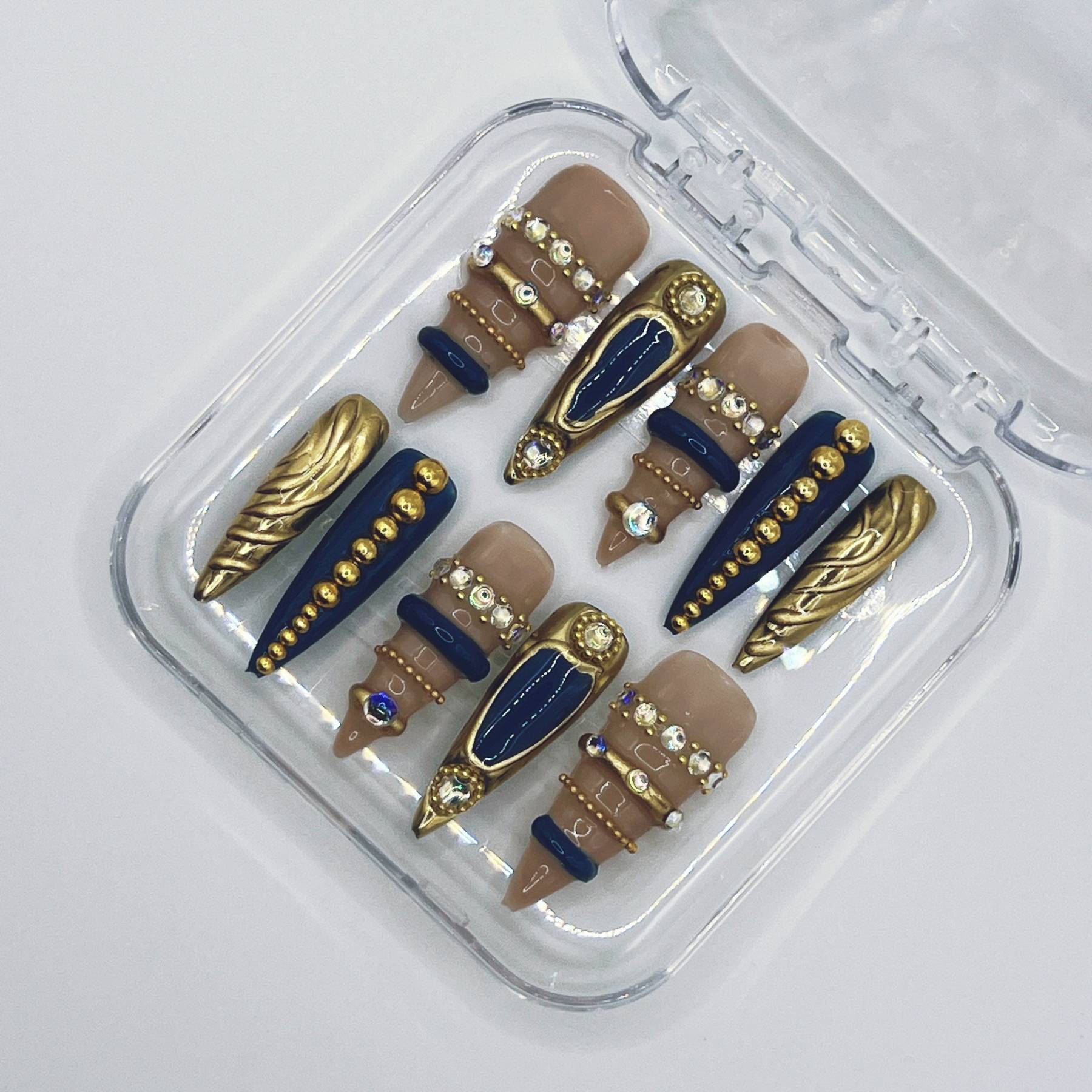 Dark elegance meets regal ornament. Midnight Crest features deep navy accents, sculpted gold textures, and jewel-like embellishments layered over a soft neutral base. Ornate details and royal tones create a look that feels both majestic and mysterious, as if drawn from a forgotten royal crest illuminated beneath moonlight.