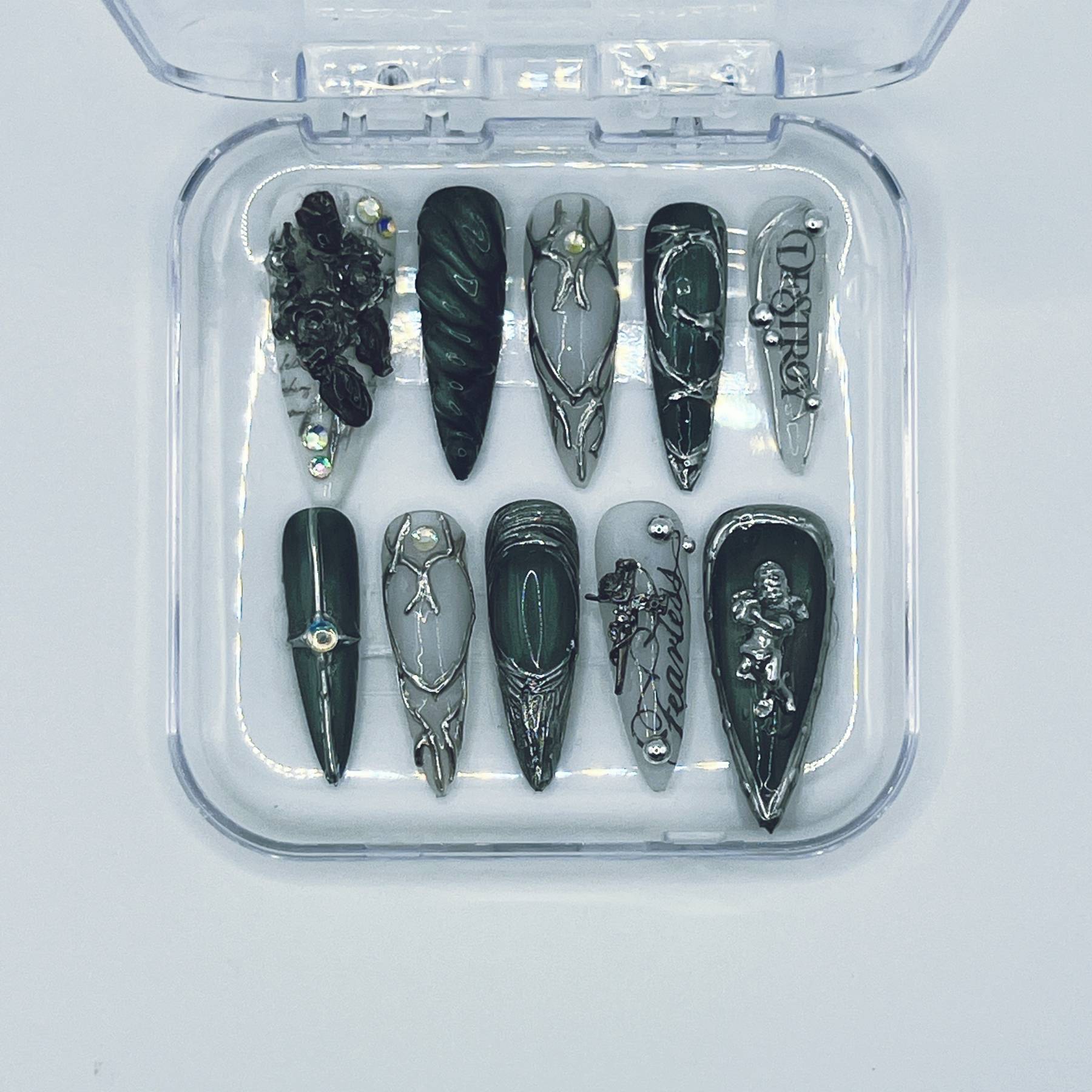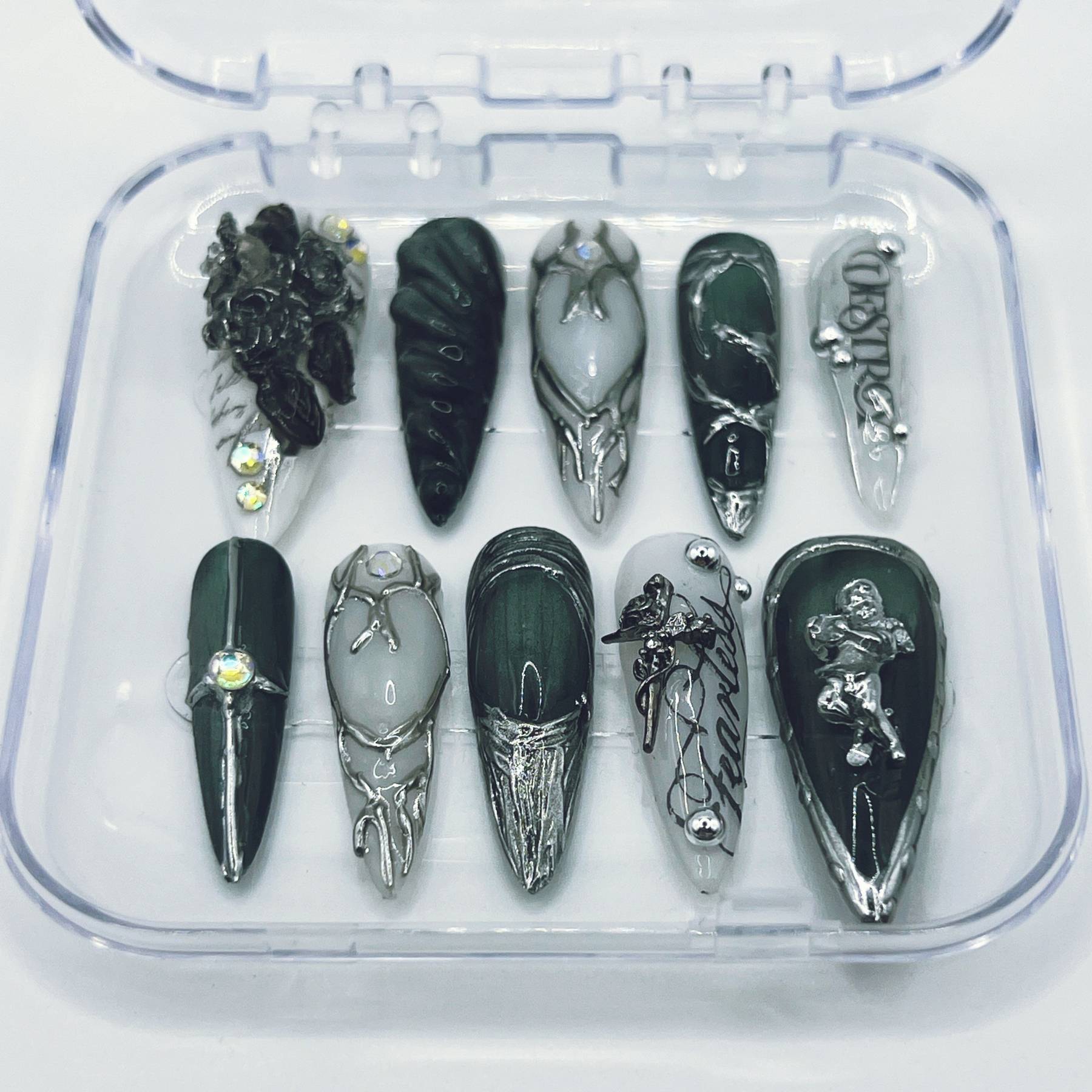 Silver Veil is a statement press-on set from the Relics & Ruins collection, featuring smoky chrome tones, cracked marble textures, hand-drawn filigree, and crystal accents for an ancient-meets-modern finish.