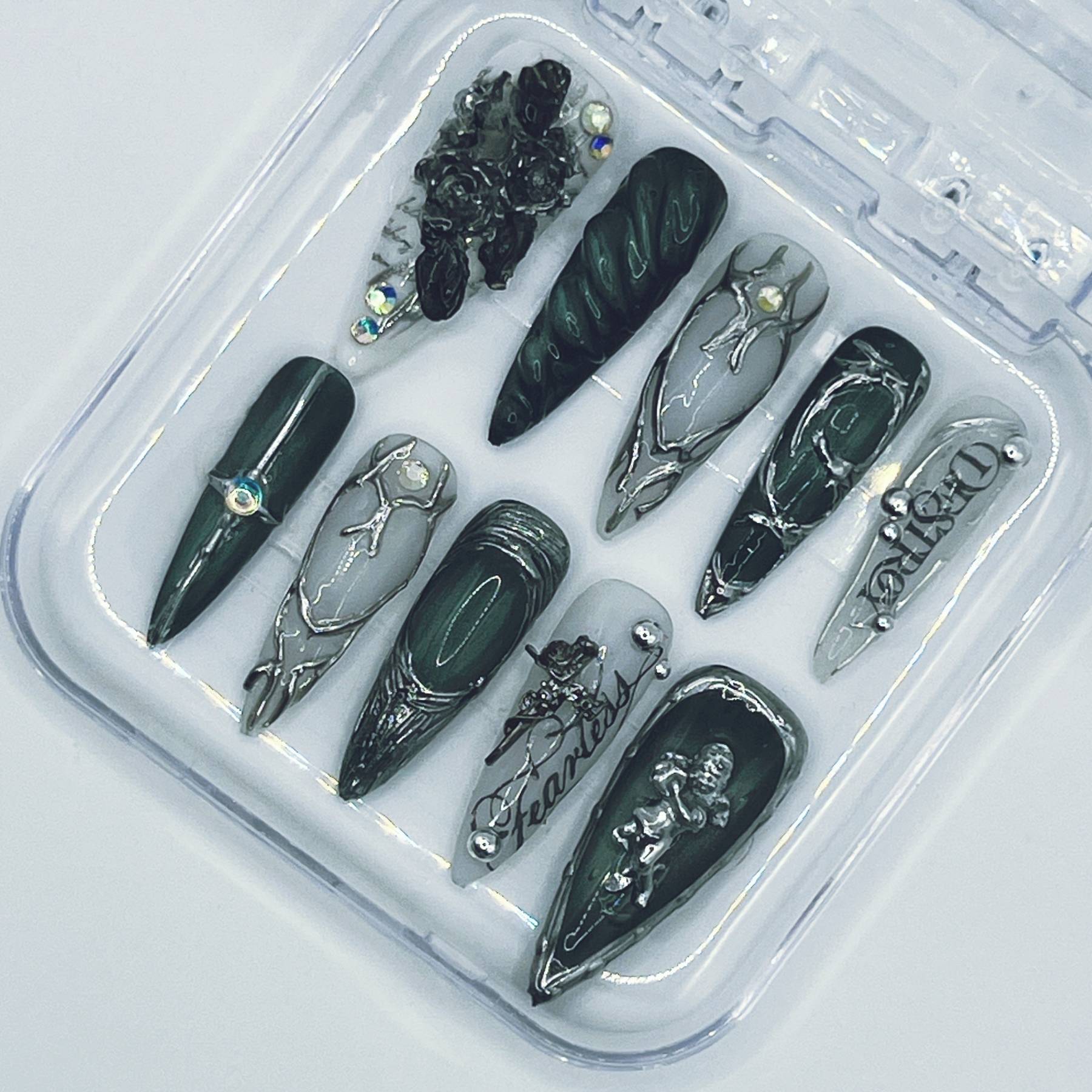 Each nail is meticulously handcrafted after purchase and made to your exact sizing, delivering a couture-level look without the salon price tag. The layered metallics and stone-inspired detailing create a mysterious, sculptural effect that feels both powerful and refined.