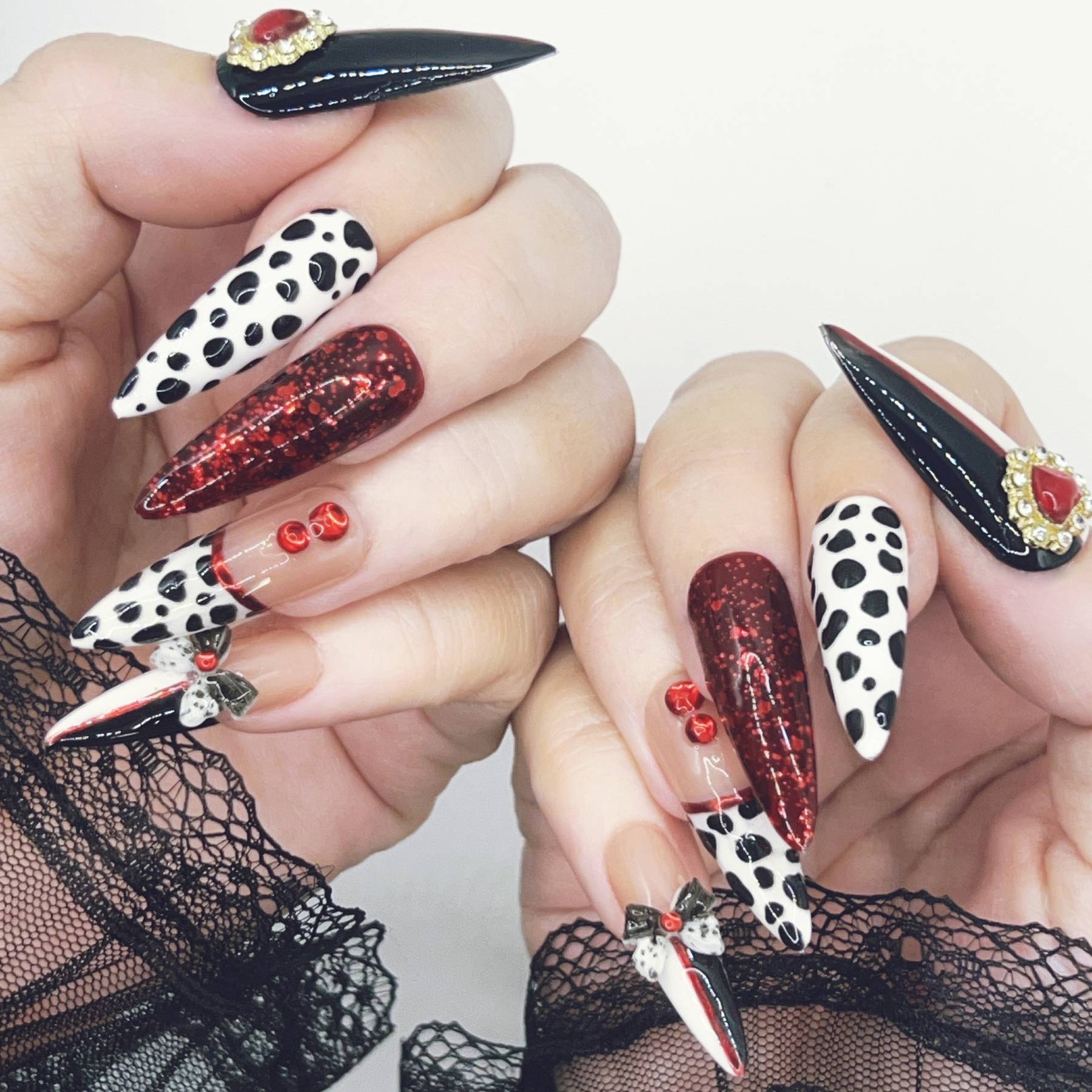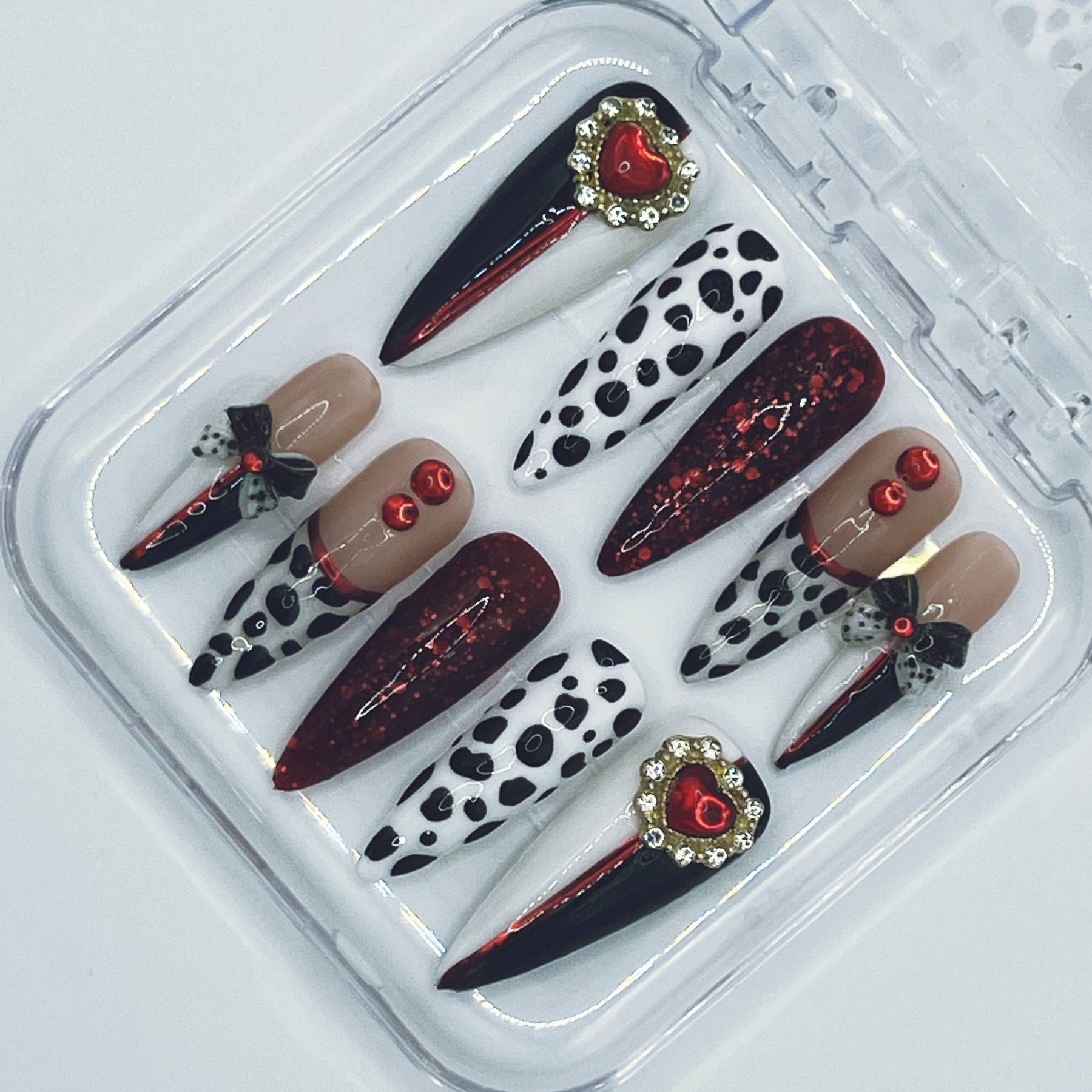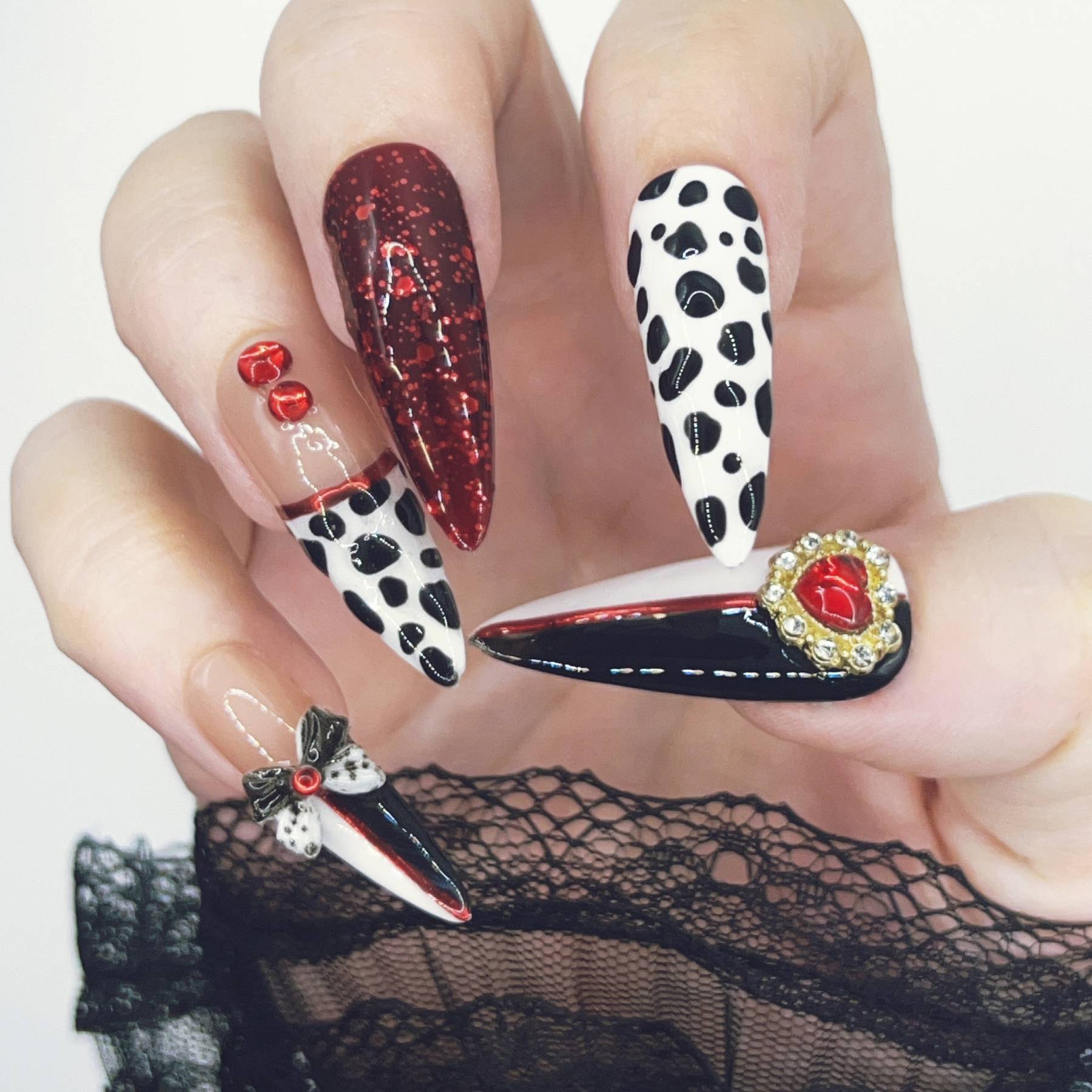 Unapologetically extravagant. Striking black and white spots collide with blood-red shimmer and decadent embellishments in a design worthy of Cruella herself. Glossy finishes, dramatic contrasts, and playful bows make this set a celebration of rebellious luxury and unapologetic style.