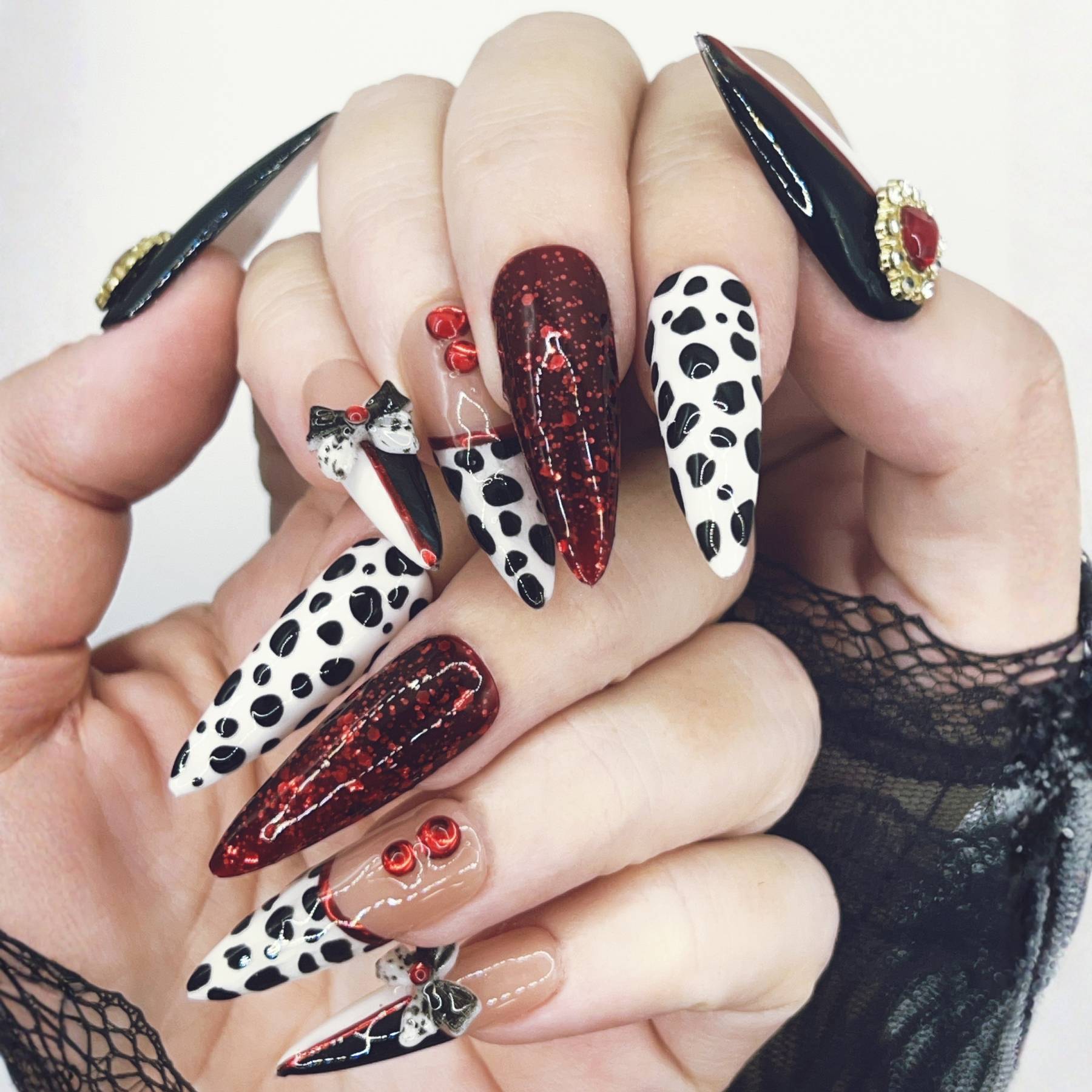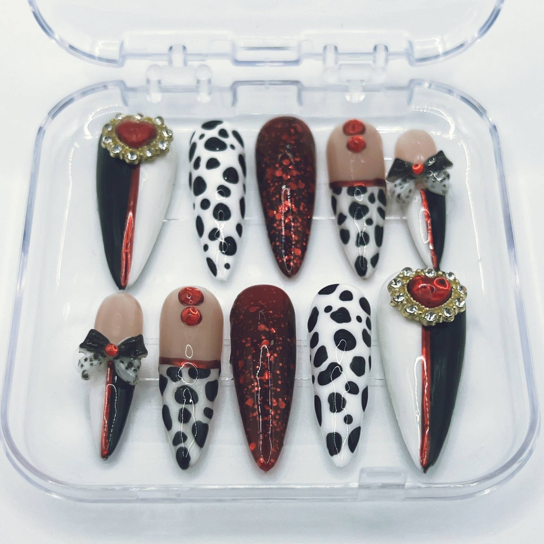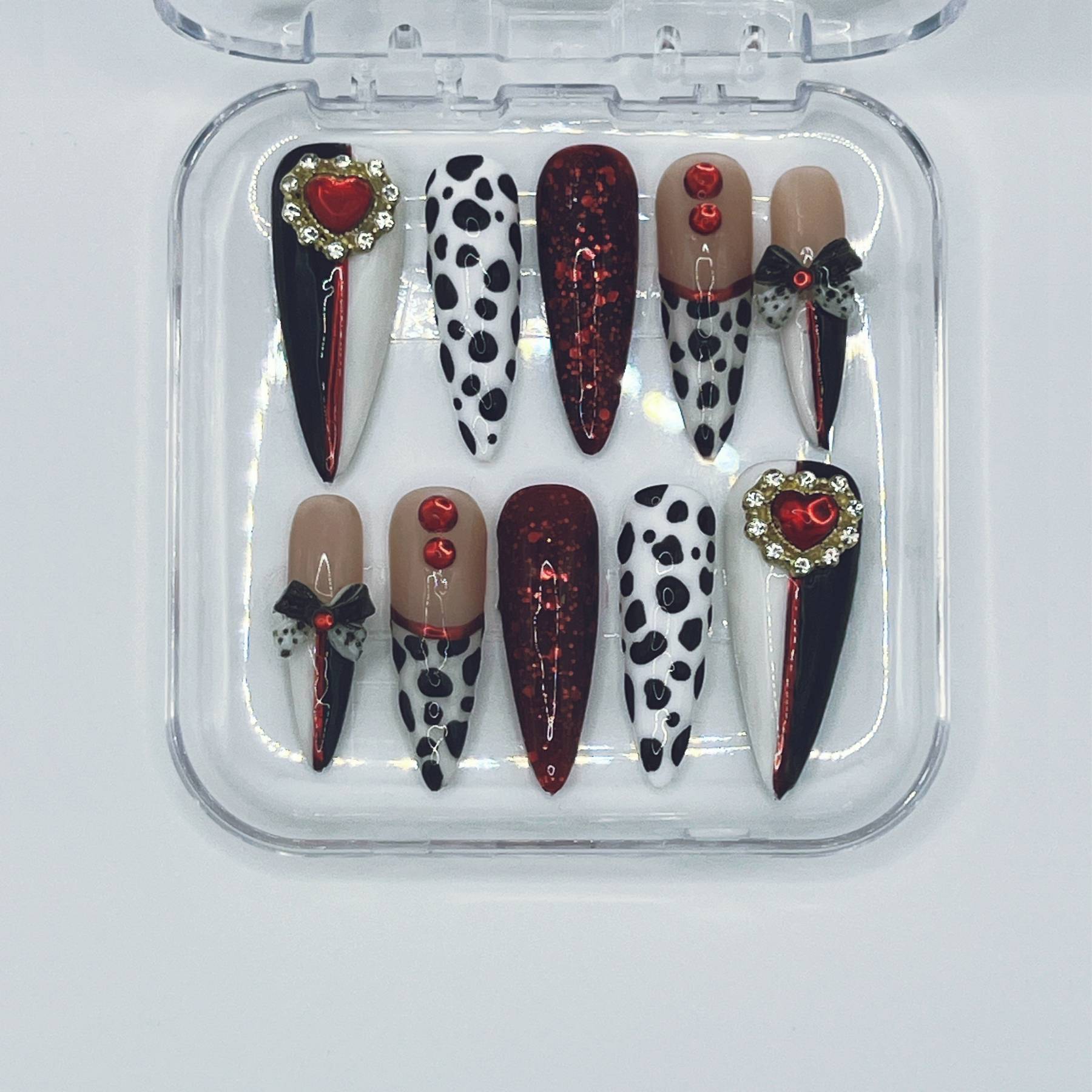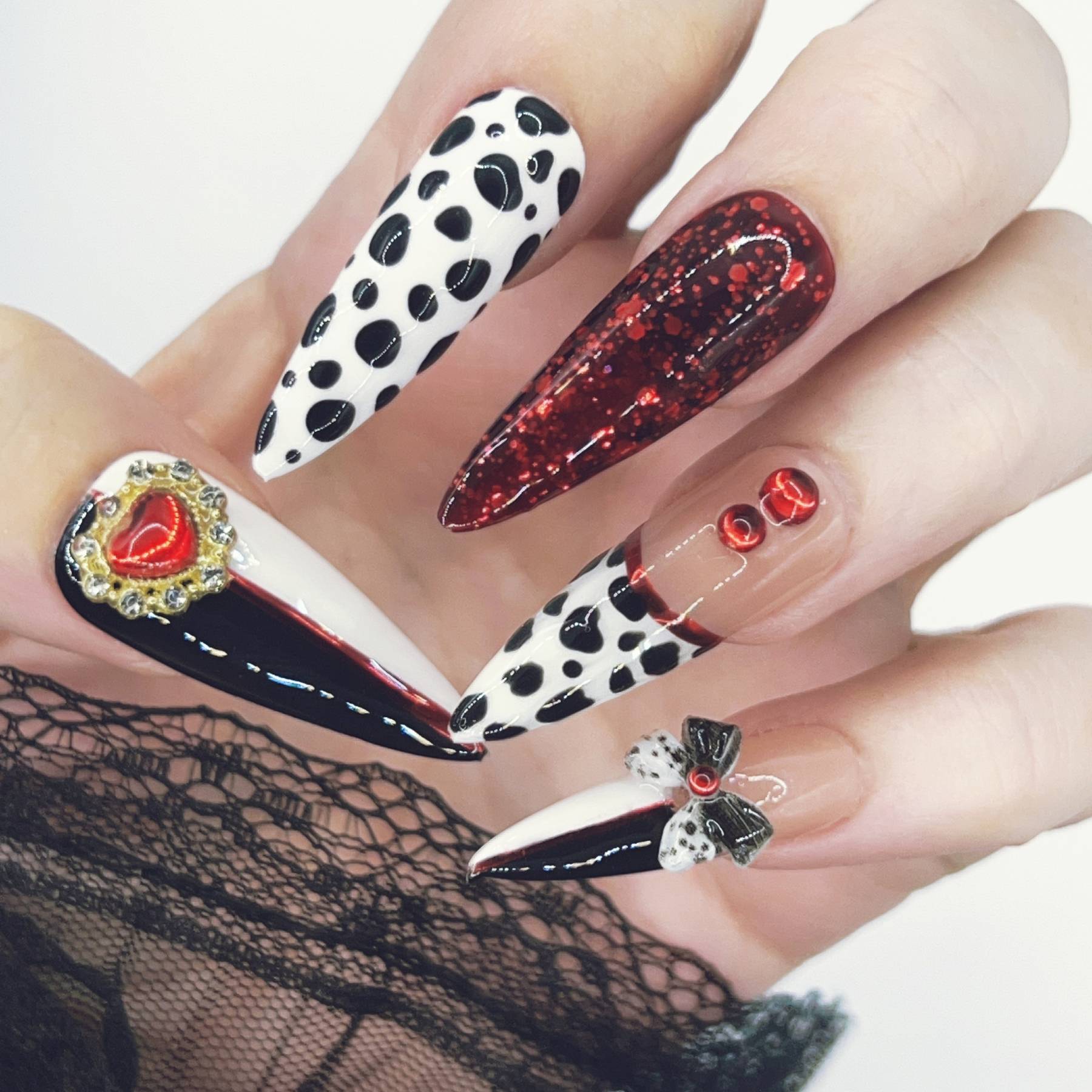 Unapologetically extravagant. Striking black and white spots collide with blood-red shimmer and decadent embellishments in a design worthy of Cruella herself. Glossy finishes, dramatic contrasts, and playful bows make this set a celebration of rebellious luxury and unapologetic style.